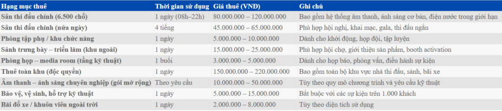 Bên cạnh đó, cung thể thao còn triển khai nhiều chương trình ưu đãi hấp dẫn dành cho các hoạt động ý nghĩa như thể thao học đường, sự kiện cộng đồng hoặc các đơn vị thuê dài hạn. Những đối tác hợp tác truyền thông hoặc tổ chức sự kiện quy mô lớn cũng có thể nhận được mức giá tốt cùng nhiều hỗ trợ đi kèm. Điều này giúp tối ưu chi phí nhưng vẫn đảm bảo hiệu quả tổ chức.